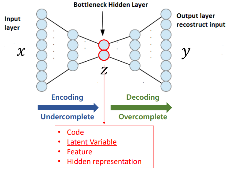 오토인코더의 구조는 위와 같습니다. 여기서 입력으로 들어온 데이터를 인코딩하여 z로 나타내는데, z를 Code, Latent Variable, Feature, Hidden representation 등 여러가지로 표현합니다. 입력을 인코딩하여 다른 Representation으로 나타내기 때문에 오토인코더를 Representation Learning(Efficient coding learning)이라고 할 수 있습니다.