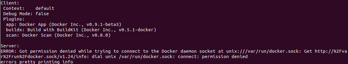 위와 같이 그냥 docker 커맨드만을 사용하면 permission denied로 에러가 발생할 수 있습니다. 이는 권한 이슈로 sudo 명령어로 입력하면 정상적으로 동작합니다. (sudo 명령어없이 사용하려면 5번을 참조하시기 바랍니다.)