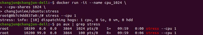 --cpu-shares의 값이 1024로 설정되었지만, 호스트에서 다른 컨테이너가 존재하지 않기 때문에 CPU를 100% 사용하고 있음을 알 수 있습니다.