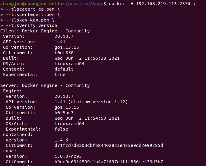 이 경우에는 인증이 정상적으로 이루어졌고, 도커 클라이언트로 원격 제어가 정상적으로 수행된 것을 알 수 있습니다.
