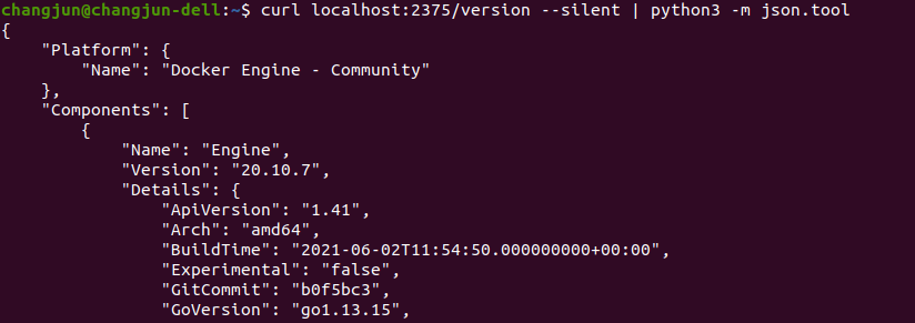 curl 192.168.99.100:2375/version --silent | python -m json.tool