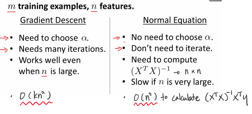 두 알고리즘을 선택하는데 중요한 것은 n의 크기이다. n이 크다면 Gradient Descent가 적합하고, n이 작다면 Normal Equation이 적합하다.