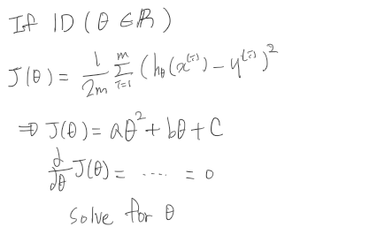 예를 들어, Feature가 1개인 경우에는, Cost Funtion은 2차방정식의 꼴이 된다. 따라서 에 대하여 미분한 결과가 0이 되도록 설정하여 풀면 된다.