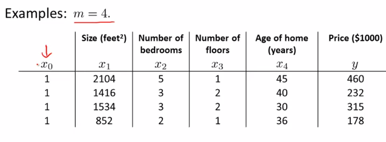 위 표는 m = 4인 Training Set이다. 우리가 가장 먼저 해야할 것은 모든 값이 1인 Feature 를 추가하는 것이다. 그리고 각각 m, n+1 차원의 배열 X와 m차원의 배열 Y를 아래와 같은 배열로 표현할 수 있고, 우리가 원하는 값
