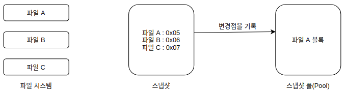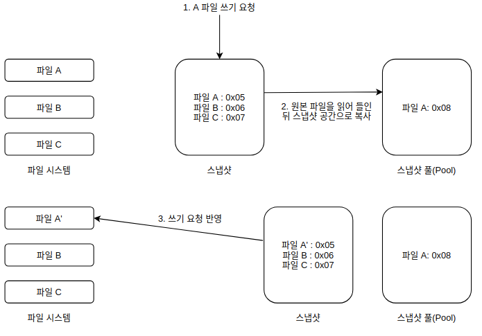 스냅샷의 기본 개념은 '원본 파일은 읽기 전용으로 사용하고, 이 파일이 변경되면 새로운 공간을 할당한다' 입니다. 스토리지를 스냅샷으로 만들면 스냅샷 안에는 어느 파일이 어디에 저장되어 있는지가 목록으로 저장됩니다. 그리고 이 스냅샷을 사용하다가 스냅샷 안의 파일에 변화가 생기면 변경된 내역을 따로 관리함으로써 스냅샷을 사용합니다.