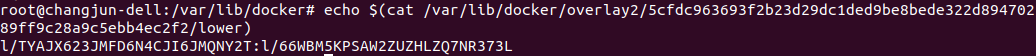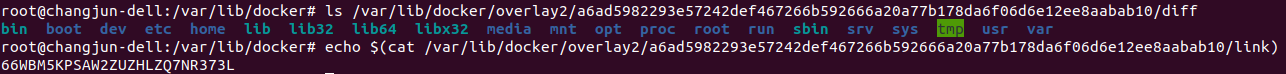 lower 파일은 이 레이어의 바로 아래쪽에 위치하는 레이어의 식별자를 담고있습니다. l/66WBM5KPS... 을 출력하고 있으며, l 디렉토리를 참조해보면 이 링크는 a6ad5982293e... , 즉 우분투 이미지 레이어의 diff를 가리키고 있습니다.