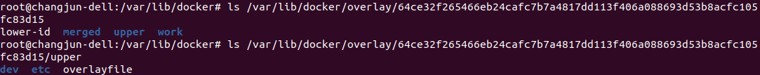 upper에는 컨테이너에서 발생한 변경 사항을 담고 있으며, 위에서 생성한 overlayfile이라는 변경 사항을 가지고 있기 때문에 upper 디렉토리에는 overlayfile 파일이 존재합니다.