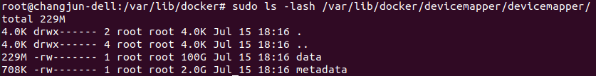 이 드라이버를 사용하도록 설정한 뒤, /var/lib/docker/devicemapper/devicemapper 디렉토리를 살펴보면 다음과 같이 2개의 파일을 볼 수 있습니다.