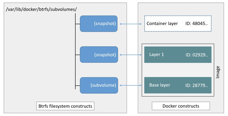 Btrfs 드라이버는 이미지와 컨테이너를 서브 볼륨과 스냅샷 단위로 관리합니다. 구조 자체는 AUFS, Devicemapper 등 다른 스토리지 드라이버와 유사합니다. 이미지에서 가장 아래에 있는 베이스 레이어가 서브 볼륨이 되고, 그 위에 쌓이는 레이어가 베이스 레이어에 대한 스냅샷으로 생성됩니다. 새로운 컨테이너가 생성되면 컨테이너 레이어가 이미지의 맨 위에 있는 스냅샷으로 생성됩니다. Btrfs는 Devicemapper와 달리 블록 단위가 아닌 파일 단위로 각 레이어를 저장하기 때문에 /var/lib/docker/btrfs 디렉토리에서 이를 확인해볼 수 있습니다.