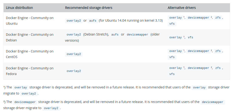 그리고 overlay와 devicemapper는 deprecated 될 예정이므로, 간단하게 어떤 것인지만 알아보고 넘어가도록 하겠습니다.