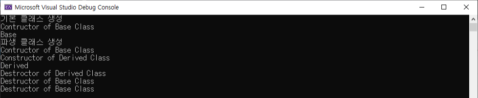 이렇게 기본 클래스의 생성자가 호출되는 동안에는 가상 함수가 적용되지 않습니다.