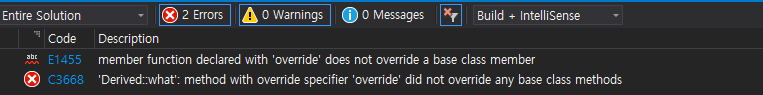 Derived의 what 함수가 오버라이드한다고 했지만, 실제로는 아무것도 오버라이드하지 않는다는 에러입니다. 위 예시에서 const를 지우게 되면 Base 클래스의 what 함수와 완전히 동일하고, 오버라이드되기 때문에 정상적으로 컴파일이 됩니다.