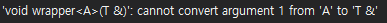 위 코드에서 A()는 우측값이고, wrapper 함수에서 T는 class A로 추론됩니다. 하지만 wrapper의 인자 A&는 우측값의 레퍼런스가 될 수 없기 때문에 컴파일 에러가 발생하게 됩니다.