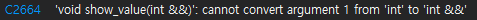 위와 같은 컴파일 에러가 발생합니다. 즉 show_value의 인자인 int&& t의 형태는 우측값만을 인자로 받을 수 있습니다.