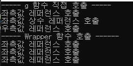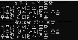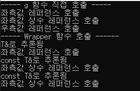 반면에 wrapper 함수를 거쳐서 g함수가 호출된 경우에는 위의 경우가 모두 좌측값 레퍼런스를 인자로 받는 g 함수가 호출되었습니다.