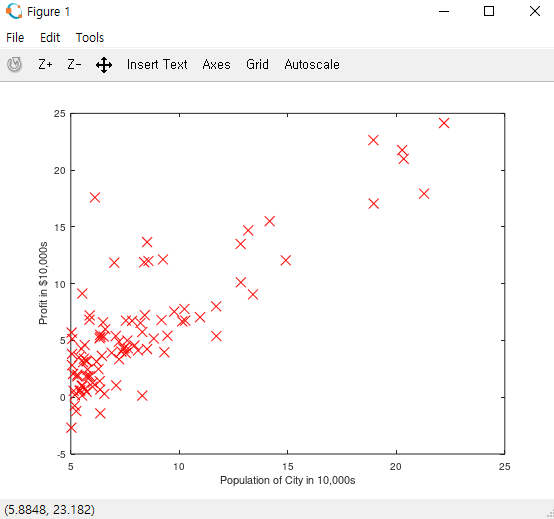 여기서 m = 97이고, x와 y는 97 x 1 행렬이다. plot함수를 사용해서 만들면 되고, 'rx'는 빨간 x 표시로 그리라는 의미고, 뒤에 'MarkerSize', 10 은 마커 크기를 10으로 설정한다는 의미이다.