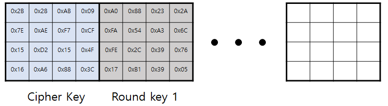 라운드키를 생성하는 KeyExpansion 연산입니다. 입력받은 암호화키로 RotWord, SubWord, XOR(rcon) 연산을 통해서 키를 확장합니다. 자세한 알고리즘은 이전 글의 Key Schedule을 참조하시기 바랍니다 !