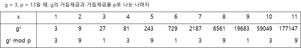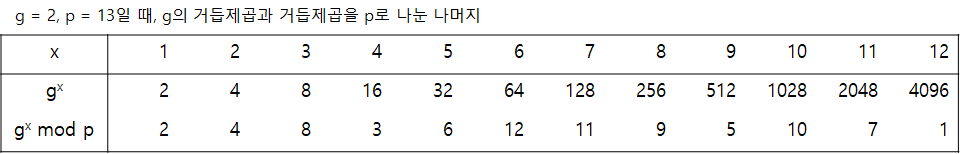 여기서 수행될 모든 계산은 모듈로 p로 이루어지고, p는 계수(modulus)이고 g는 밑(base)가 됩니다.