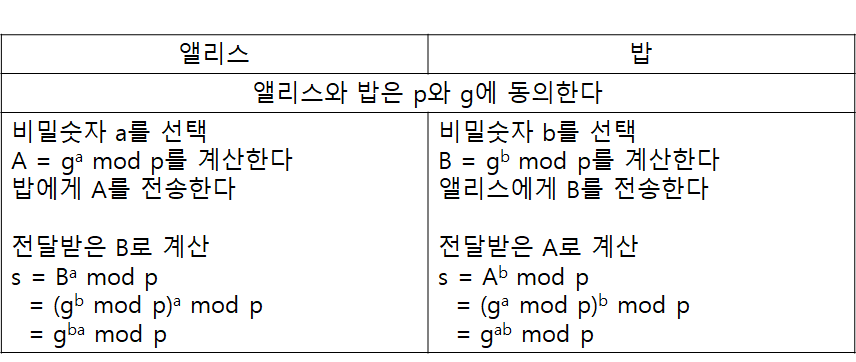 \((g^b \text{ mod } p)^a \text{ mod } = g^{ba} \text{ mod } p\)와