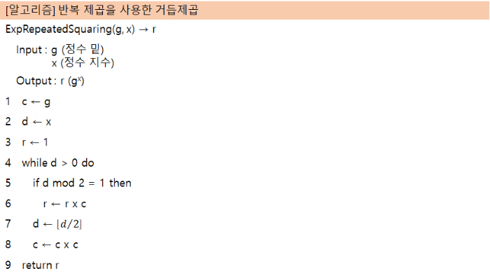 이런 방식으로 거듭제곱을 구하면 지수 x의 이진 표현에 사용된 비트수만큼의 횟수로 g의 거듭제곱을 구할 수 있습니다.