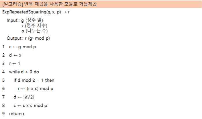 위 알고리즘은 g와 x를 입력 받아 \(g^x\) 값을 출력합니다. 1행에서 밑을 설정하는데, c는 \(g^{2^0}\)에 해당하는 g로 설정하고, 2행에서는 x의 이진 표현을 가져오기 위해 x로 초기화한 변수 d를 설정합니다.