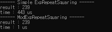 여기서 문제는 각 반복에 드는 시간인데, 모듈로 연산과 2로 나누는 연산은 단순히 이진 연산을 수행하므로 시간이 오래 걸리지 않습니다. 알고리즘의 6행의 곱셈과 8행의 제곱은 어느 정도 시간이 걸릴 수 있습니다.