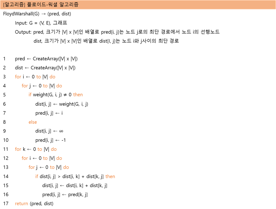 1행에서 10행까지 초기화를 수행하는데, \(|V| \times |V|\) 크기를 가진 pred와 dist 배열에 적절한 값을 설정합니다.