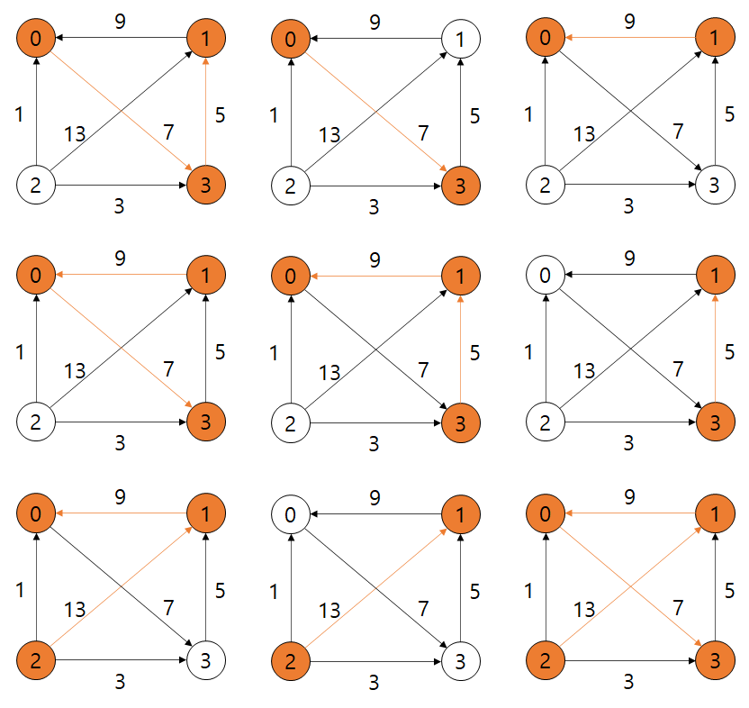 그래프에서 i 노드에서 j 노드로 가는 모든 경로는 아래와 같습니다. 알고리즘을 수행하면서 아래의 경로를 모두 체크하게 되는 것이죠.