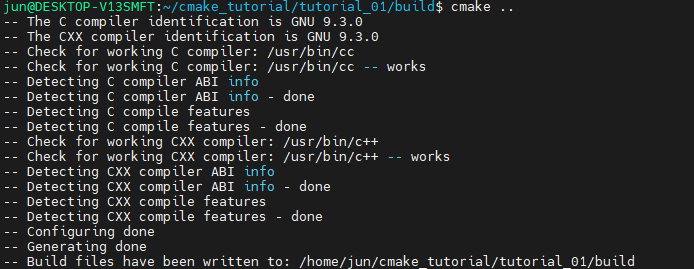 그럼 다시 'cmake ..' 명령어로 빌드 파일을 생성하면, build 폴더 내에 'TutorialConfig.h' 라는 파일이 생성된 것을 확인할 수 있습니다.