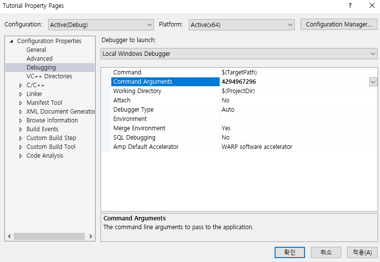 윈도우의 경우에는 argument를 입력해주어야 하기 때문에 [Tutorial - Properties - Debugging - Command Arguments]에 argument를 입력해주어야 합니다.