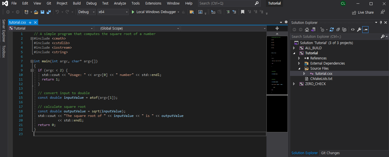 https://github.com/Kitware/CMake/blob/master/Help/guide/tutorial/Step1/tutorial.cxx