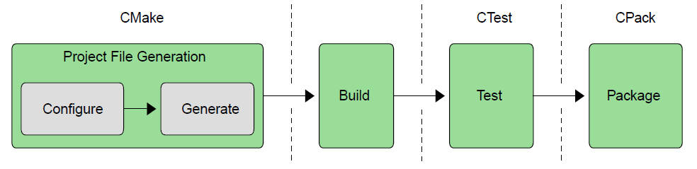 그리고 빌드는 각 플랫폼에 맞추어서 진행할 수 있으며(빌드 도구를 CMake에서 호출할 수도 있습니다.), 이 단계 이후에는 테스트 및 패키징 단계를 위한 CTest나 CPack이 포함되는데 이것도 별도로 추가하여 간단하게 사용할 수 있습니다.