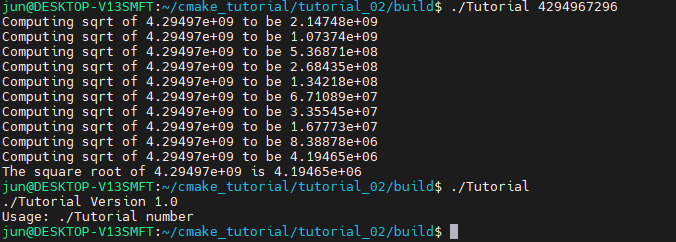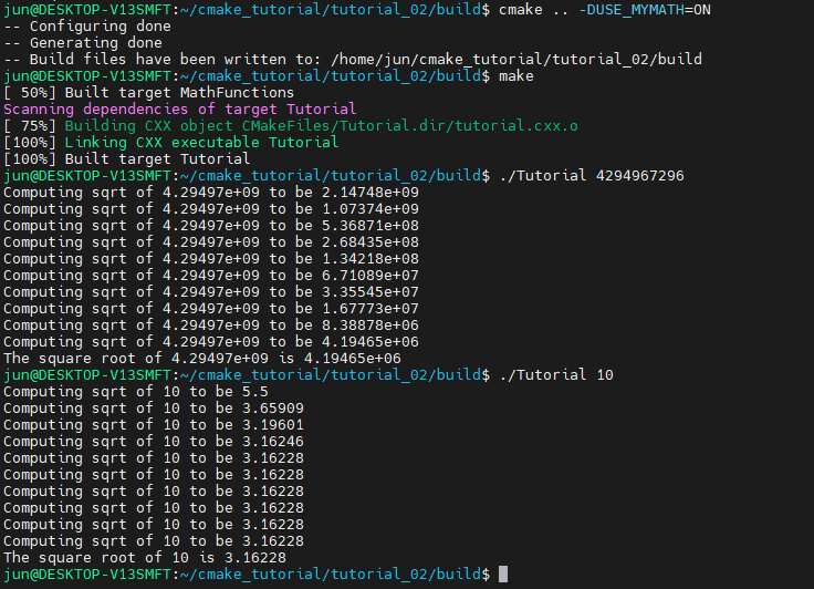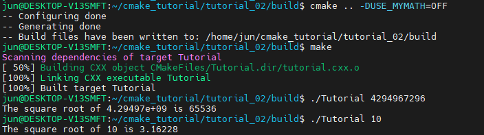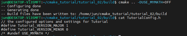 생성된 TutorialConfig.h 에 USE_MYMATH가 define 되지 않은 것을 확인할 수 있습니다.