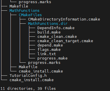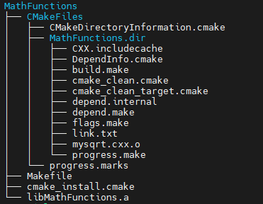 build 디렉토리의 하위 디렉토리인 MathFunctions 디렉토리의 안을 살펴보면, libMathFunctions.a가 있는 것을 확인할 수 있습니다. 만약 윈도우에서 빌드했다면, build - MathFunctions - Debug(or Release) 에 MathFunctions.lib 파일이 생성되었을 것입니다.