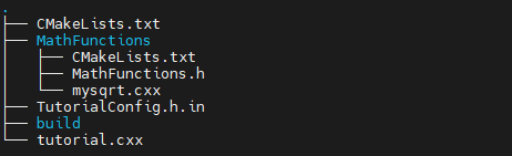 이 MathFunctions 디렉토리에는 header file인 MathFunctions.h와 source file인 mysqrt.cxx가 있으며, sqrt 함수와 같은 기능을 하는 mysqrt 함수가 선언 및 정의되어 있습니다.