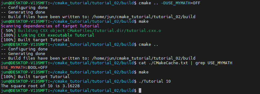 +) 추가로 USE_MYMATH를 OFF로 cmake, 빌드 한 후에 다시 아무런 옵션없이 cmake를 실행하면 option 명령어 때문에 USE_MYMATH가 ON으로 설정될 것 같지만 그렇지 않습니다. 이는 CMakeCache.txt에 USE_MYMATH 값이 그대로 남아 있기 때문입니다.
