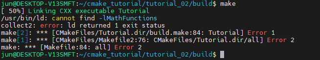 하지만 target_link_directories 명령어를 통해 실행파일(타겟) Tutorial은 존재하지 않는 MathFunctions를 링크하고 있기 때문에 링크 에러가 발생한 것입니다.