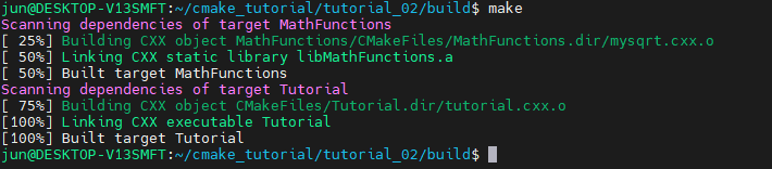 MathFunctions 라이브러리를 생성할 때, 타입을 명시하지 않았기 때문에 STATIC으로 설정되어 'libMathFunctions.a'가 생성되고, MathFunctions가 정상적으로 빌드가 된 것을 확인할 수 있습니다.
