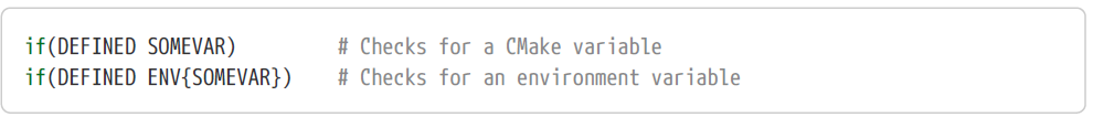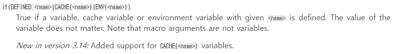 지정된 이름의 변수가 있다면 true를 반환합니다. 변수의 값은 관련이 없고 존재 여부만 테스트됩니다. 특정 환경 변수가 정의되어 있는지 확인한데도 사용할 수 있으며, CMake 3.14 버전부터는 캐시 변수도 체크할 수 있습니다.