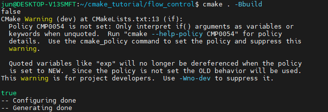 첫 번째 if문은 false, CMake 버전 3.1 이하로 설정했을 때에는 동일한 if문이 true로 처리되는 것을 확인할 수 있습니다.