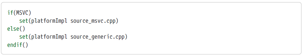 예를 들어, 두 개의 C++ 소스 파일이 있는 프로젝트가 있다고 가정해보겠습니다. 하나는 visual studio(window) 컴파일러를 위한 소스 코드이고 다른 하나는 다른 모든 컴파일러로 빌드하기 위한 소스코드입니다.