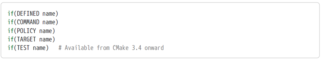 마지막으로 살펴볼 if() 명령의 유형은 다양한 CMake entities의 존재 여부 체크입니다.