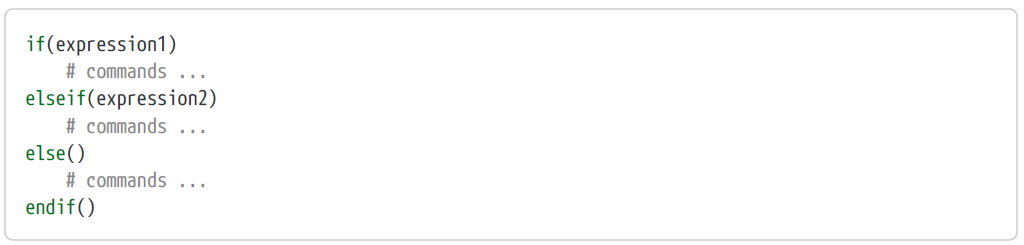 (CMake 초기 버전에는 else() 및 elseif() 의 argument로 expression1을 반복해서 추가해주어야 했지만, CMake 2.8.0 이후로는 argument를 비워두어야 합니다.)