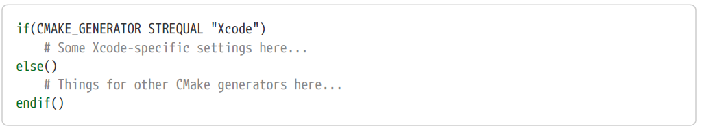 위 경우는 macOS용에서 Xcode generator가 사용될 때를 체크하고 있습니다. 물론 Ninja나 Unix Makefiles를 사용하려는 경우에는 else()로 빠져서 수행될 것입니다.