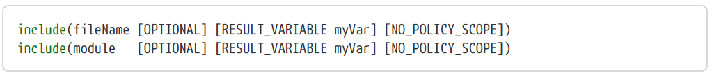 - include()와 add_subdirectory()는 기본적으로 새로운 policy scope를 정의하지만, include() 명령에서 NO_POLICY_SCOPE를 사용하면 새로운 policy scope를 정의하지 않도록 할 수 있습니다.