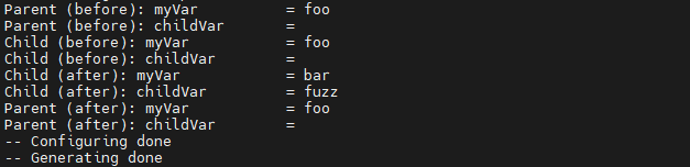위에서 설명한 변수 범위(scope)에 관한 동작은 add_subdirectory()로 추가된 디렉토리가 부모 scope의 변수에 영향을 주지 않고 원하는 모든 변수를 변경할 수 있다는 것을 보여줍니다. 즉, 잠재적으로 의도치 않은 변경으로 부모 scope에 영향을 끼칠 수 있는 모든 가능성을 차단해줍니다.