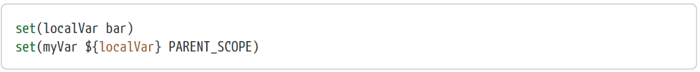 하지만, 자식 scope에서 변경되거나 추가된 변수가 부모 scope에서 필요한 경우가 있습니다. 예를 들어, 서브 디렉토리의 소스 파일 목록을 생성하고 상위 디렉토리에 다시 전달하는 경우가 있습니다.