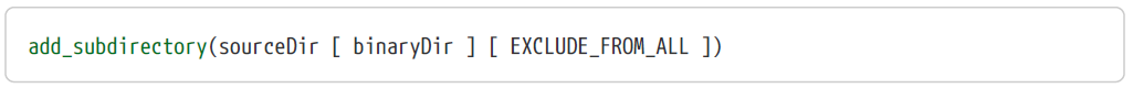 EXCLUDE_FROM_ALL 키워드는 선택적으로 지정할 수 있고, 이는 추가되는 하위 디렉토리에서 정의된 Target이 기본적으로 프로젝트의 ALL Target에 포함되어야 하는지 여부를 제어하기 위한 것입니다.