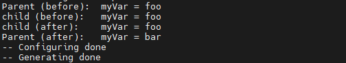 주목해야 할 점은 mysub 디렉토리, 즉 자식 scope에서 myVar 변수를 PARENT_SCOPE 키워드를 통해 수정을 했는데, 자식 scope의 myVar는 변경되지 않았다는 점입니다.