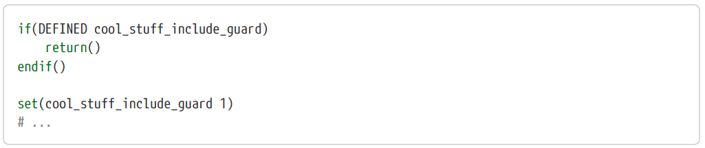 또한, 매우 큰 프로젝트에서 동일한 파일을 여러 위치에서 include() 명령으로 호출하는 경우가 발생할 수 있습니다. 따라서, 이것을 확인하고 파일을 CMake 처리 동안 한 번만 호출되도록 방지하는 로직이 필요합니다. 이는 C/C++ 헤더 파일을 여러번 include하지 않도록 방지하는 것과 유사하며, 아래의 방법을 사용하거나 include_guard()를 사용할 수 있습니다.